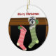 O estoque do Feliz Natal pendurou pela lareira com Schnauzer diminuto. www.Schnauzers-Rule.com