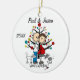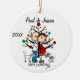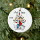 Um ornamento cerâmico redondo bonito do feriado do Natal da lembrança caracteriza uma figura casal da vara que espera um bebê que está na frente de uma árvore de Natal decorada com dois gatos, um branco, uma cinza, e o texto que nos lê "está esperando!". Você pode personalizar esta figura bonito ornamento da vara adicionando seus nomes e ano em curso!
