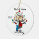 Um ornamento cerâmico redondo bonito do feriado do Natal da lembrança caracteriza uma figura casal da vara que espera um bebê que está na frente de uma árvore de Natal decorada, e o texto que nos lê "está esperando!". Você pode personalizar esta figura bonito ornamento da vara adicionando seus nomes e ano em curso!