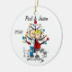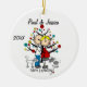 Um ornamento cerâmico redondo bonito do feriado do Natal da lembrança caracteriza uma figura casal da vara que espera um bebê que está na frente de uma árvore de Natal decorada com dois gatos, um branco, uma cinza, e o texto que nos lê "está esperando!". Você pode personalizar esta figura bonito ornamento da vara adicionando seus nomes e ano em curso!