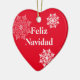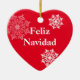 Esse Enfeites de natal cerâmico é mostrado na forma cardíaca em um impressão de flocos de neve vermelho e branco. Texto do Feliz Navidad Personalize este item ou comprar como está.
