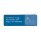 Um rótulo de endereço de volta de Natal com um fundo azul de inverno com um ornamento e floco de neve pendurado em um contorno azul pálido na margem direita. O texto está em um fazer de forma modelo, é fácil mudar e torná-lo seu.