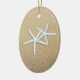 Dois estrelas-do-mar na areia da praia num ornamento oval pendurado. Adicione à árvore de Natal como recordação de uma época especial ou ocasião importante. Quatro linhas de texto de modelo permitem personalizar conforme necessário com nomes, informações - como "primeiro Natal" ou texto de "nossas férias" - e local e ano. Perfeito para celebrar uma memória quente de férias climáticas.
