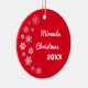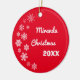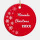 Flocos de neve acentuam o lado deste ornamento com texto totalmente personalizável à direita. Altere o fundo vermelho mostrado para qualquer cor que você preferir! O estilo e o tamanho da fonte também podem ser alterados. Se há espaço para ajustado, você pode dizer. Algumas ideias: um casal no primeiro Natal, um grupo familiar, etc. A parte de trás do ornamento é vazio para você personalizar ainda mais, se desejado.