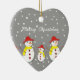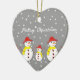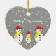 Três bonitinhos Enfeites de natal personalizados de bonitinhos com três adoráveis bonitos bonecos de neve com chapéu vermelho, cachecol amarelo, olhos de botão e palitos em uma cinza com flocos de neve.