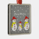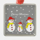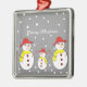 Três bonitinhos Enfeites de natal personalizados de bonitinhos com três adoráveis bonitos bonecos de neve com chapéu vermelho, cachecol amarelo, olhos de botão e palitos em uma cinza com flocos de neve.