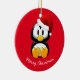 Enfeites de natal mostrado em forma redonda com fundo vermelho e um impressão de pinguim de feriado bonito. Personalize este item ou comprar como está.