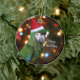Ornamento severo bonito do Macaw! O papagaio veste um chapéu vermelho brilhante do papai noel na frente de um fundo colorido do inverno. Divertimento para a árvore do Xmas do amante do pássaro esta época natalícia.