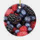 Fotografia de mirtilos coloridos, framboesas e amoras coloridas impressas nas bordas da frente do ornamento. Cor personalizável e texto em reverso.