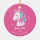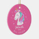 Personalize o Enfeites de natal de unicórnio giro da irmã mais velha e datada com um unicórnio doce, azul-turquesa, rosa e roxo e enquadrado com flores delicadas colocadas sobre um fundo rosa escuro.