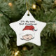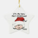 Você pode facilmente mudar o ano nesse adorno de natal personalizável do White Baby 1rua antes de fazer pedidos. Possui um bebê em um boné vermelho e texto no estilo de criança que diz "É o meu Primeiro Natal!".