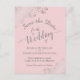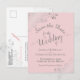 Este belo cartão postal foi projetado para dar aos seus amigos e familiares um aviso prévio do seu casamento. Ele apresenta um design simples, porém elegante, com caligrafia cinza rendada e ondulações e espirais prateadas em falso foil nos cantos, sobre um fundo cor-de-rosa suave. A parte de trás tem um gráfico fofo de "marque-nos" assim como espaço para um site e outras informações.