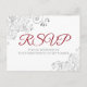 Estes belos cartões-postais de RSVP tornarão fácil para os seus convidados responderem ao seu convite de casamento com o número de participantes e uma escolha de refeição, ou para enviar seus pêsames. O design é simples, mas elegante, com texto vermelho e cinza e uma borda de filigrana floral prateada em fólha de estanho falsa.