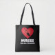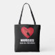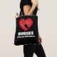 Faça uma declaração de moda com esta bolsa de tote "All-Over-Impressão". Este saco mostra um coração vermelho com um tiro e um texto que diz "ENFERMEIRAS CHAMAM TODOS OS TIROS". Este saco é modesto e durável, e excelente para executar tarefas ou dar como presente.