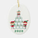 Este enfeite engraçado apresenta alguns elfos ocupados empilhando rolos de papel higiênico. Abaixo dos elfos está o ano "2020 em verde sobre um fundo branco brilhante. As costas têm a mesma design. As cores incluem verde, vermelho, marrom e rosa. O tem outro elfo decorando uma árvore de Natal.