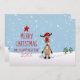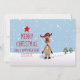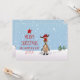 Uma bela e engraçada ilustração de Natal: Uma rena com passos na neve e uma grande tipografia Feliz Natal e uma árvore feliz ano novo de 2023.
