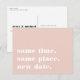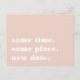 Precisa adiar ou remarcar o seu casamento? Informe os convidados com esses cartões-postais modernos e alegres em rosa enrubescido chic com letras brancas nítidas. O design baseado em tipografia engraçada e inteligente apresenta "mesmo horário, mesmo local, nova data" na frente, com a nova data do casamento e detalhes no verso.