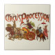 Circo Vitoriano - Palhaços com Cavalos de Carruagem e Circo Rico Esta procissão circense é uma imagem antiga de uma antiga parada de circo. Os palhaços estão correndo ao redor do anel de circo e me acenando na plateia. O palhaço em listras vermelhas também tem um parasita guarda-chuva. Há um macaco num pônei, e uma grande carruagem de circo com dois cavalos, sendo conduzido por outro palhaço. A ilustração é em cor de cheio, com grande título lido que diz: A procissão de circo. Vermelho, azul, laranja e marrom são as cores de vintagem proeminentes na ilustração. A ilustração, A Procissão do Circo, foi o cobrir de trás de um antigo livro infantil impresso em 1888 pelos Irmãos McLoughlin, de Nova York.