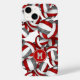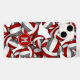 Esta capas de iphone tematizada de vôlei para meninas apresenta tamanhos variados de vermelho, cinza e volicola branca arranjadas em um padrão aleatório de fundo branco personalizável — os painéis vermelho e cinza do volleyball são misturados com um padrão caleidoscópico floral para uma aparência esporosa e artística que ainda é esportiva - personalize seu monograma - por katz_d_zynes