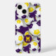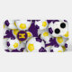 Esta capas de iphone temática de futebol apresenta bolas de futebol roxo, douradas e brancas de tamanho variado dispostas em um padrão aleatório em um fundo roxo personalizável — personalize seu monograma, letra de diversidade ou número de camisa — por katz_d_zynes