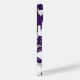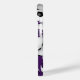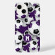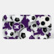 Esta capas de iphone temática de futebol apresenta bolas de futebol roxas, pretas e brancas de tamanho variado organizadas em um padrão aleatório em um fundo roxo personalizável — personalize seu monograma, letra de varsidade ou número de camisa — por katz_d_zynes