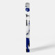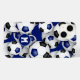 Esta capas de iphone de tema de futebol apresenta bolas de futebol azul, preto e branco de tamanho variado organizadas em um padrão aleatório em um fundo azul personalizável — personalize seu monograma, letra de diversidade ou número de camisa — por katz_d_zynes