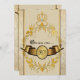 O convite para o casamento de contos de fadas com ouro deixa um quadro de filigrana, uma coroa de ouro, um diamante, uma fita de ouro e um monograma sobre um fundo de papel vintage em apuros. (representações gráficas a tinta) Facilmente personalizadas com seus detalhes especiais do dia. ::ENVELOPES INCLUI: