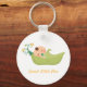 Uma doce ervilha em uma chaveiro de cápsula para mamãe ser ou nova mãe que está esperando bebês. Design apresenta um adorável bebê com um pacificador de bebê verde na boca dormindo alegremente em uma grande cápsula. No final da cápsula brotam flores, folhas e fios. O texto diz "Doce Pequena Ervilha" que você pode personalizar com seu próprio texto.