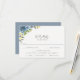 Arranjo de flores e folhagens em aquarela em tons de azul empoeirado, amarelo e verde, cartões de RSVP de casamento com opção de escolha de refeição. Estilo de design de tipografia cinza moderno e elegante. Parte de trás do cartão apresenta cor azul empoeirada sólida com duas linhas de texto de modelo para nomes e data.