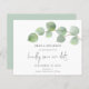 O Script Moderno Eucalyptus Salva A Data. Um alternativo de 4,5 pol x 5,6 pol com preço inferior. Disponível em um STOCK DE CARTÃO SEMI-GLOSS 110 lb, que é a opção padrão (mais espesso para convites), OU um STOCK de PAPEL THINNER FINISH 80 lb FINISH (ideal para gabinetes). Os envelopes são um extra opcional e são ligeiramente maiores que o tamanho da placa. Um design de folhagem minimalista para convidar seus convidados para salvar seu encontro. Por gentileza, Salve nossa data está em um script moderno.O resto do texto que você pode personalizar facilmente. As cores do texto e do plano de fundo podem ser alteradas se você desejar por meio da opção personalizar mais.