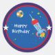 Um design de aniversário fofo com uma nave espacial voando pelo céu com um planeta e estrelas. A imagem está rodeada de uma borda circular vermelha com uma estrela branca em cada lado sobre um fundo azul. O texto pode ser personalizado para sua ocasião especial.