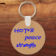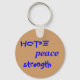 Um chaveiro castanho com a mensagem de "ESPERANÇA, PAZ, FORÇA" significando, filosofia, frase