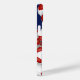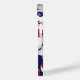 Esta capas de iphone de tema de futebol apresenta bolas de futebol vermelho, azul e branco de tamanho variado organizadas em um padrão aleatório em um fundo azul personalizável — personalize seu monograma, letra de diversidade ou número de camisa — por katz_d_zynes