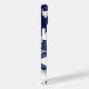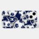 Esta capas de iphone temática de futebol apresenta bolas de futebol de tamanho azul e branco variadas organizadas em um padrão aleatório sobre um fundo azul personalizável — personalize seu monograma, letra de varidade ou número de camisa — por katz_d_zynes