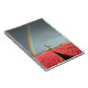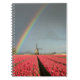 O caderno com um arco-íris colorido em um céu escuro sobre um moinho de vento e um cheio do campo de tulipas vermelhas brilhantes durante um primavera atacam em uma paisagem perto de Amsterdão nos Países Baixos.