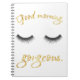 O caderno na moda e à moda, aperfeiçoa para meninas adolescentes, jovens mulheres, ou qualquer um que ama a composição. Características de design a frase "bom dia, lindo" no impressão do ouro e em um grupo bonito de pestanas.