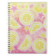 As fatias frutados, efervescentes, do agridoce… de limão, as bolhas e as estrelas flutuam na limonada cor-de-rosa. Caderno com um design customizável do rosa, do amarelo, o alaranjado e o branco para que você personalize com seus próprios texto, imagens e ideias. A imagem criou de um desenho colorido original do lápis e da tinta por Jess Perry.