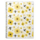 Um caderno espiral que caracteriza um teste padrão com ilustrações de abelhas, de flores, e de bolinhas do mel.