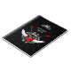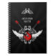 O caderno personalizado com a ilustração do rock and roll que caracteriza dois cruzou guitarra elétricas com asas e enfeites barrocos do vintage em vermelho, no branco e no preto.