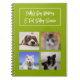 Caderno para pet sitter ou passeador de cães. Ajuda o amante de animais a manter o controle de seu negócio. Caderno espiral verde brilhante com quatro fotos de gatos e cães na frente. Use as fotos de amostra se desejar, ou substitua-as por fotos favoritas suas. Personalize com um título em fonte de letra manuscrita moderna no topo. Use para organizar um pequeno negócio.
