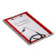 Design de negócio elegante profissional para finalidades médicas: uma prancheta de couro vermelha com papel vazio e um estetoscópio. Aperfeiçoe para relacionado com o mercado à saúde e aos cuidados médicos como um escritório médico, o escritório do doutor, a clínica ou o hospital. Para o pessoal hospitalar, médicos, enfermeiras; elegante, nobre e elegante.