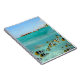 Caderno com um tubarão que persegue peixes da borboleta na água azul clara da lagoa da ilha do Pacífico tropical Bora Bora do arquipélago Polinésia francesa de Tahiti. Acima da água você pode ver bungalows do overwater.