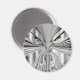 Olhos minosos sobre uma máscara de assombro em preto e branco sobre um fundo de aço inoxidável ondulado.