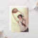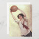 Ilustração esportiva vintage com design de uma jogadora de basquete feminino alcançando a bola em um jogo.