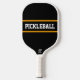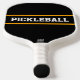 Este design desportivo divertido apresenta texto atlético dentro a uma faixa central horizontal escura preta, realçada com faixas amarelas ouros contra fundo preto. As cores e o texto amarelo ouro PICKLEBALL podem ser personalizados.