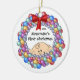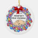 Os primeiros enfeites de natal do bebê caracterizam um bebê espreitando adorável com uma grinalda!    Personalize com sua informação do bebê e data e você são todos ajustam-se para ir!  Presente datado maravilhoso da lembrança para Natal do seu bebê o ø.