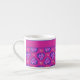 Café Espresso bonito ou Caneca de Sopa com padrão de corações e flores em tons de magenta, rosa, roxo e azul.
