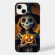 Um esqueleto adorável carregando uma mini abóbora, misturando-se mestiço e fofo para t-shirts e merch do Halloween.