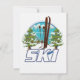 Esqui, logotipo de poster de esqui em uma linda paisagem de desenho animado.