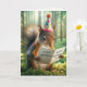 Um esquilo fica em uma floresta iluminada pelo sol, vestindo um chapéu festivo enquanto segura um cartão de aniversário. O texto dentro pode ser alterado.
